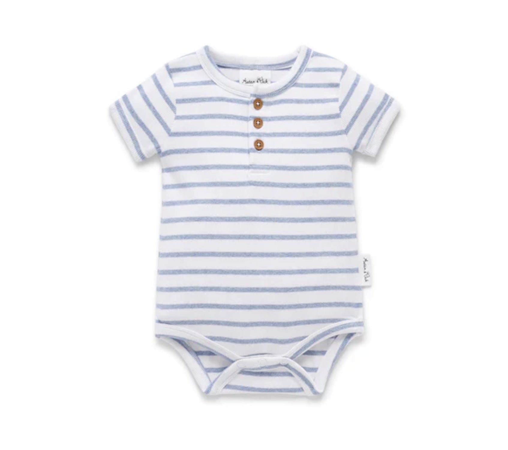 A super simple wardrobe staple, easily paired to create versatile outfit choices our Blue Stripe Rib Henley Onesie will be a go to piece.