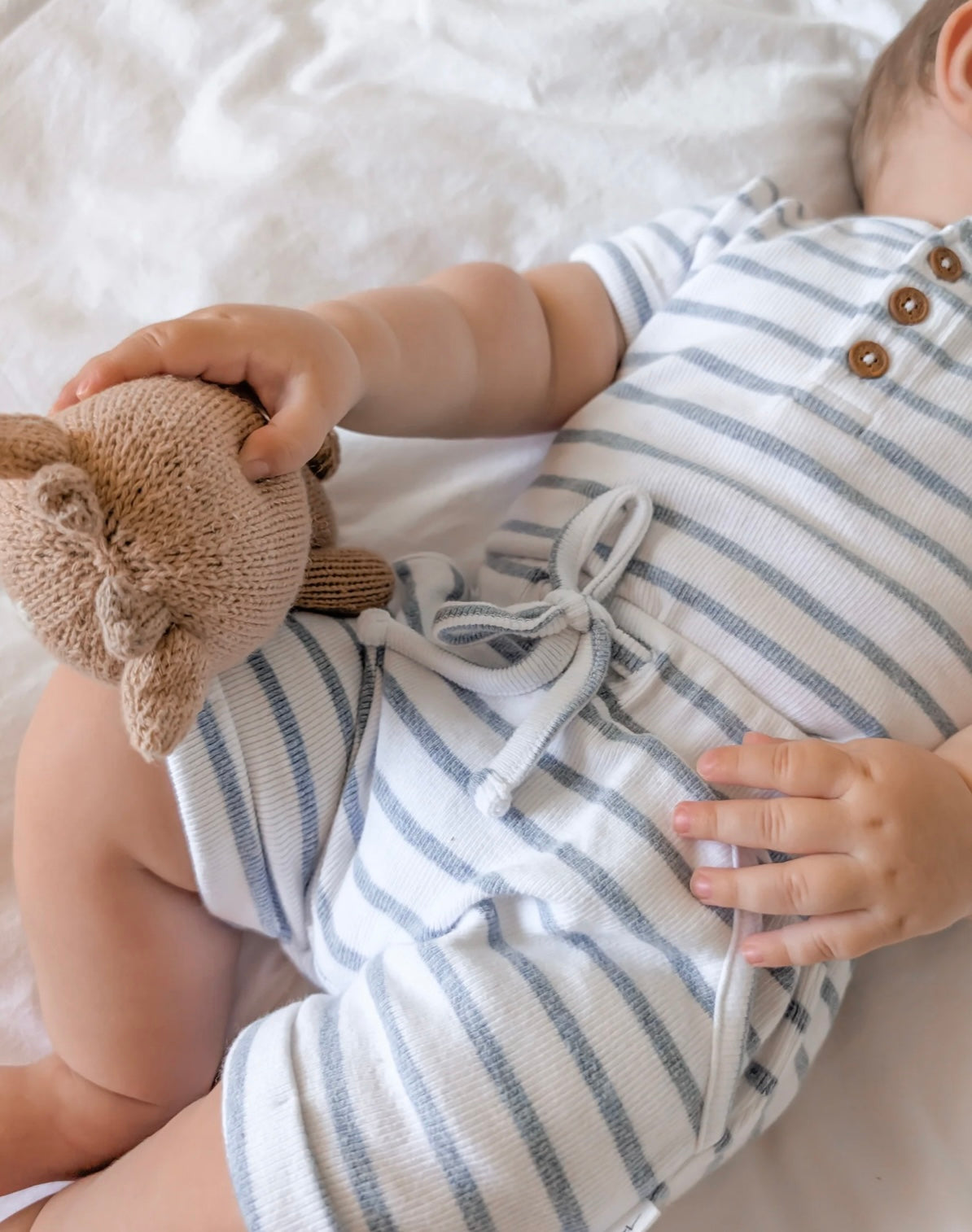 Keep little explorers cool and comfortable in our Blue Stripe Harem Shorts. Designed with plenty of room for wriggly legs and crafted from soft breathable organic cotton rib, these shorts are a timeless staple for any little guy's wardrobe.