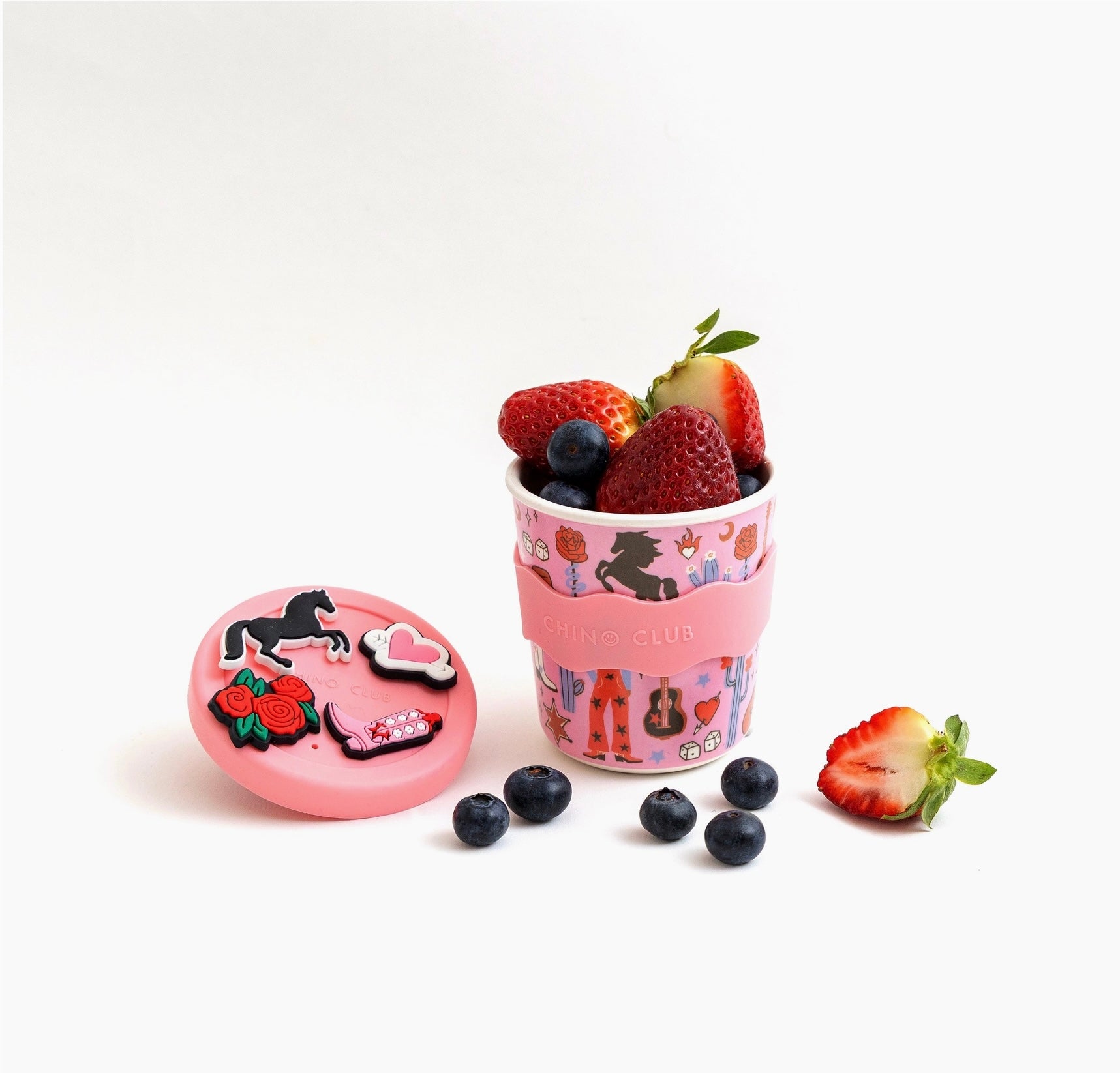 The cup includes 5 charms in total 3: Cowgirl Charms clip onto the lid and 2 charms including 1 custom Chino Cup charm are stored inside the cup. Kids can swap and play with their charms to make their cup uniquely theirs.