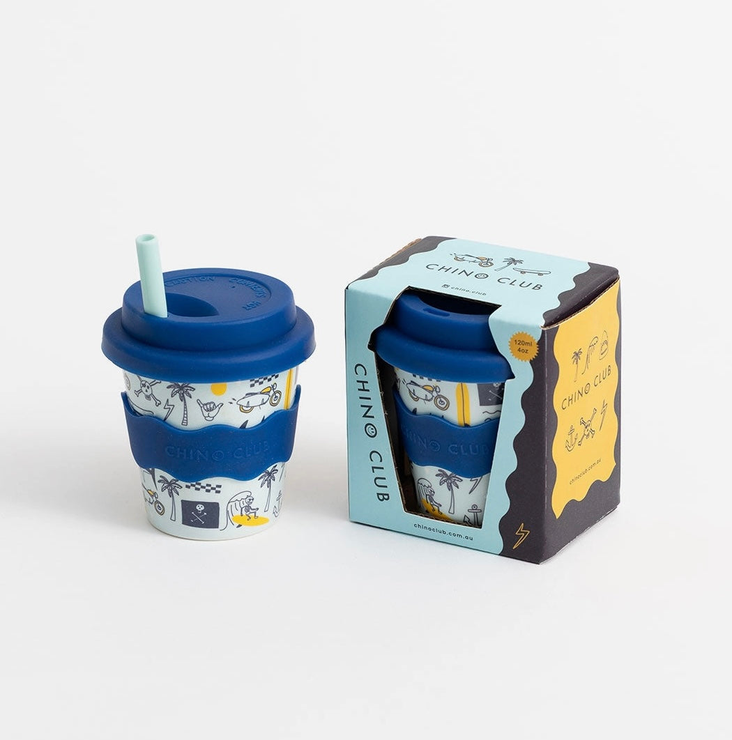This cup is decorated with rad themed designs for the cool kids – perfect for little groms. Bamboo based cup with a silicone lid and complete in a cute gift box. Straws sold separately. * Eco-friendly alternative to single-use cups * Spill free with straws* with stoppers and tight lid seals * Silicone lid and grip band * Lightweight * 120ml 4oz * Dishwasher safe * Perfect for babychinos or water on-the-go *Straw NOT included. Do not microwave. Dishwasher safe. Don't miss our new straws designed to perfectly fit your babychino cup. Cup size: 7cm (height), Top Diameter 6.8cm (width) Cup volume: 120ml (4oz)