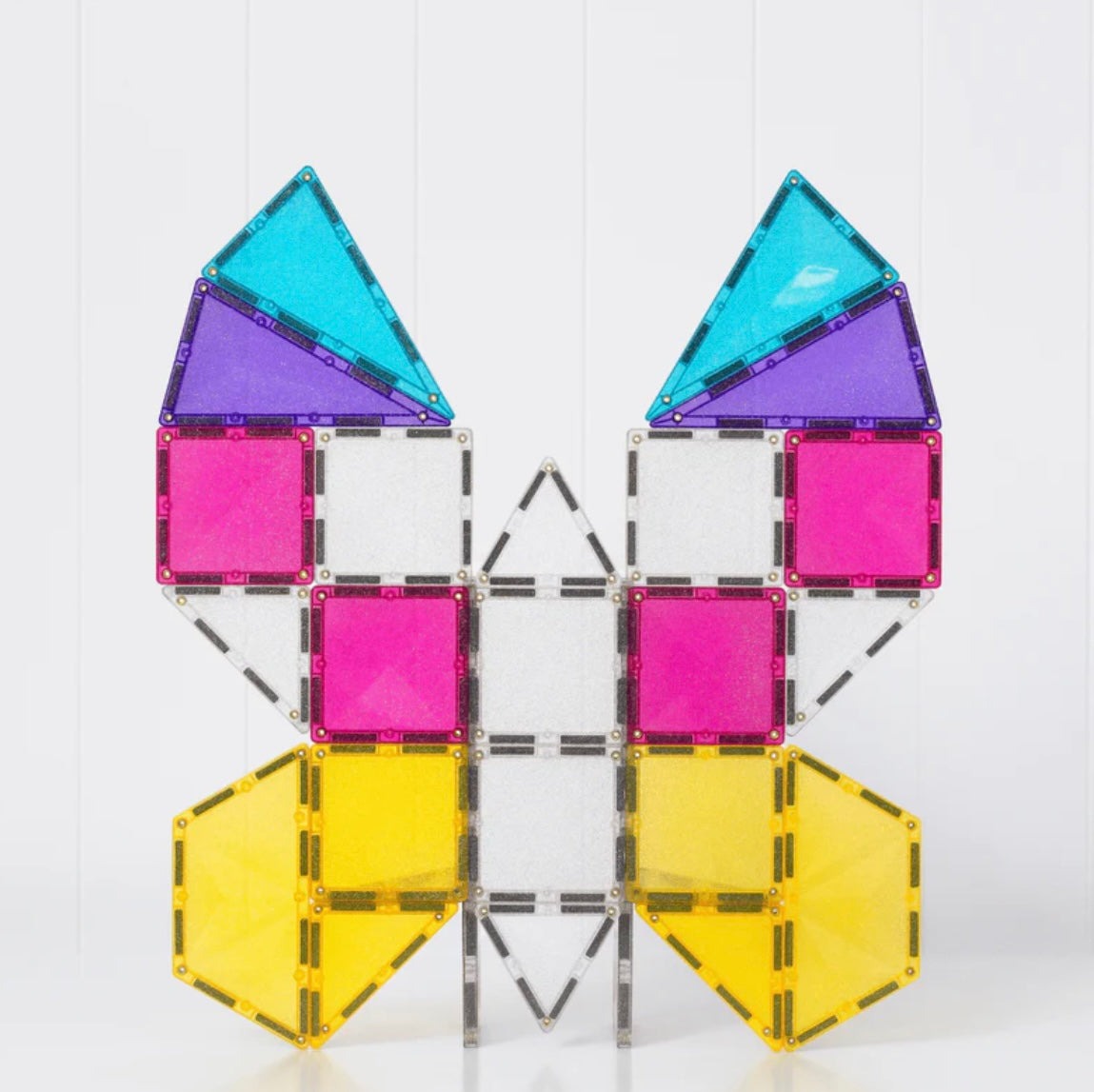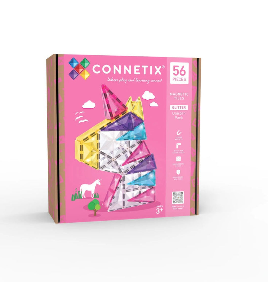 Designed for the unicorn lovers, fantasy dreamers and creative explorers, this pack is filled with delightful play possibilities. Featuring a stunning combination of glitter magnetic tiles in dazzling clear and vibrant bright colours of pink, yellow, teal and purple, plus a thoughtful selection of shapes in squares, hexagons, rectangles, triangles and trapezoids to bring your sparkly unicorn creation to life!