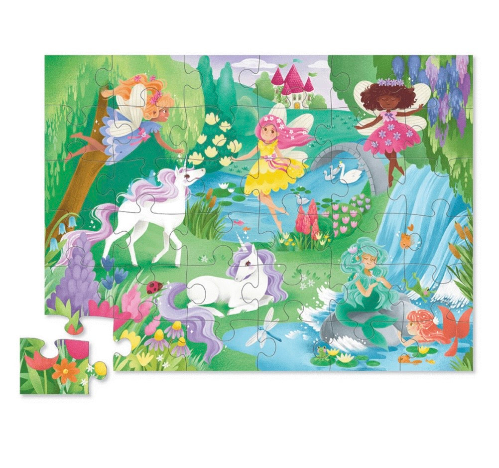 Unicorns, fairies and flowers abound in this beautifully illustrated Unicorn Forest 36-piece floor puzzle. All wrapped up in its unique contour-shaped storage box, the jumbo, sturdy pieces of this high-quality puzzle are ideal for little hands.