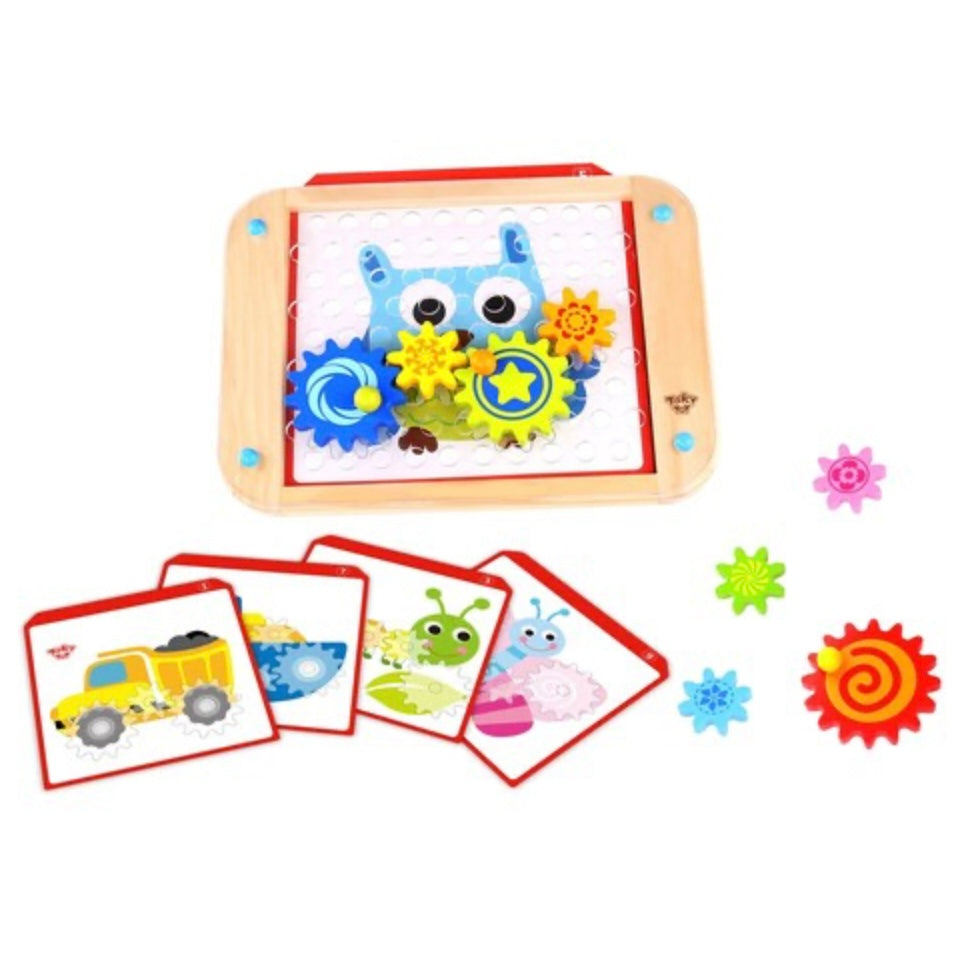 Get their cogs spinning with this beautiful beginner gear puzzle! Pick one of the five double-sided puzzle cards and slide it into the slot of the wooden frame. Each one features a vibrant picture with outlines of gears arranged throughout. It's up to your little puzzler to fit the right-sized gears into the slots of the puzzle board so they connect just right over the picture. Then, give one of the gears a spin, and - Whoosh! - Eyes widen with excitement as they all spin together! Motor skills, matching skills, and cause-and-effect exploration combine in a way that really gets the mind spinning with wonder when kids start building with the Go Go Gears.
