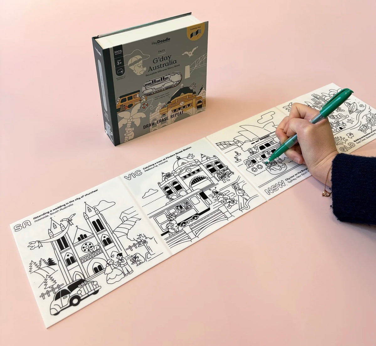 G’day Australia is an interactive story book-style colouring mat that explores some of the most iconic landmarks across each Australian state and territory.