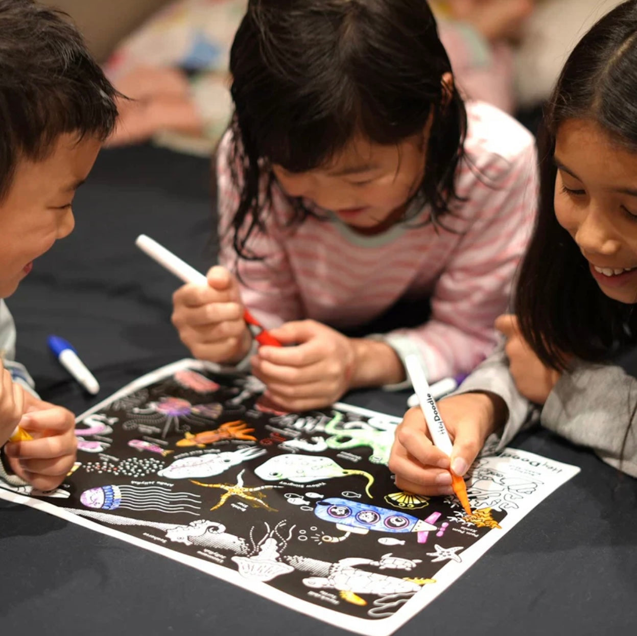 Hey Doodle - Dive into creativity with the Glow-in-the-Deep Mini Mat, a compact version of our best-selling glow-in-the-dark design from the HeyDoodle Classic range! This travel-sized, reusable colouring mat features a magical underwater scene filled with bioluminescent sea creatures that glow when the lights go out. Kids can colour, wipe, and reuse it over and over, perfect for mess-free fun at cafés, in the car, or on holiday. Small in size but big on imagination, it’s an ideal screen-free activity for curious little hands. Glow-in-the-dark ocean-themed mini mat Reusable and easy to clean, just wipe and restart Promotes creativity, fine motor skills, and discovery Includes 3 non-toxic markers and a travel pouch Perfectly sized for party favours, stocking fillers, or on-the-go fun!