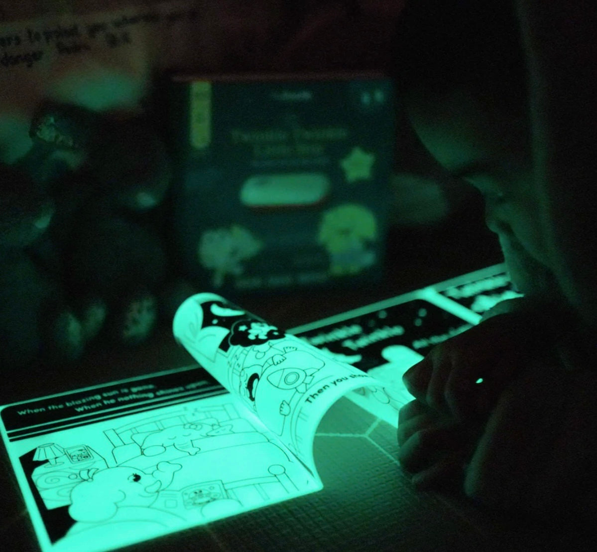 As the lights go out, the story continues with soft glowing elements that turn bedtime or quiet play into a soothing, sensory experience.