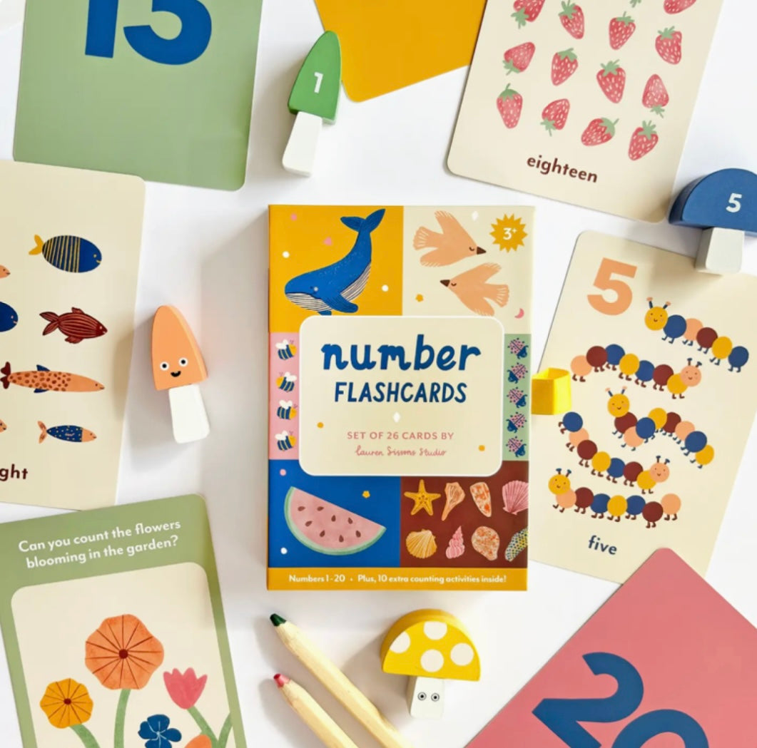 Designed to spark curiosity and build confidence, this set of beautifully illustrated flashcards introduces numbers 1–20 in a playful and engaging way. Each card features bold, colourful numbers on one side and charming, nature-inspired illustrations on the reverse. What makes this set extra special? It includes 5 double-sided cards with 10 fun and interactive counting prompts—perfect for hands-on learning and reinforcing key counting skills. Plus, there’s an additional card with positive affirmations for kids to read aloud with a grown-up, helping to boost their confidence as they learn. Crafted with little hands in mind, these durable laminated cards are finished with rounded corners, perfect for little hands to hold again and again. - Set includes: 26 double-sided laminated flashcards, printed with eco-friendly soy inks - Card size: 150 x 100mm / 5.9 x 3.9"