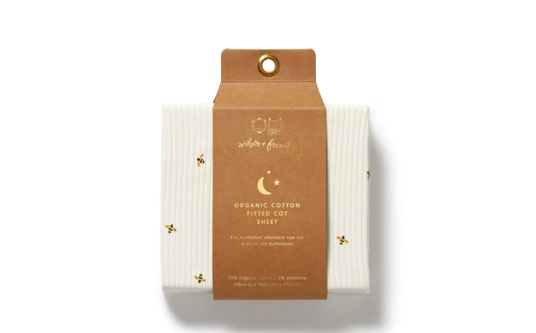 This fitted cot sheet by Wilson and Frenchy is made from GOTS-certified organic cotton and features a hand-illustrated all-over print. Completely breathable, it's perfect for your baby to sleep soundly at night. Plus, it's stretchy so it fits a range of cots, including Australian standard size as well as Boori cots. Key Features: Gentle on baby's delicate skin. Great baby shower gift. Made from GOTS-certified organic cotton. Australian owned and designed. Packaged in a bio-degradable bag. Details: Fitted Sheet dimensions: 130cm long x 70cm wide x 19cm deep. 95% GOTS-certified organic cotton, 5 % elastane. Certified by: Ecocert, EGL 212333. Machine washable. Made in India.