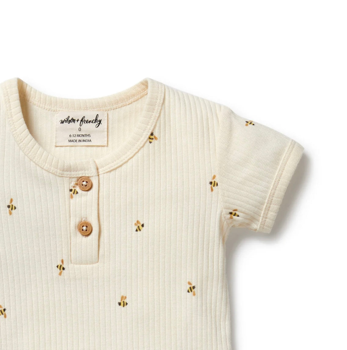 A soft and comfy essential for your baby’s wardrobe. Made from breathable GOTS-certified organic drop needle cotton, this baby bodysuit features our sweet bee mine all-over print, a side neck opening, and snap crotch for easy, fuss-free changes. Gentle on delicate skin, free from harmful chemicals, and perfect for everyday wear. Key Features: Side Neck Opening. Short Sleeved bodysuit. Snap leg closure for easy nappy changes. Made with GOTS-certified organic cotton. Sustainably produced. Packaged in a bio-degradable bag. Details: 95% GOTS-certified organic cotton, 5% elastane. Certified by: Ecocert, EGL 212333. Machine washable. Made in India.