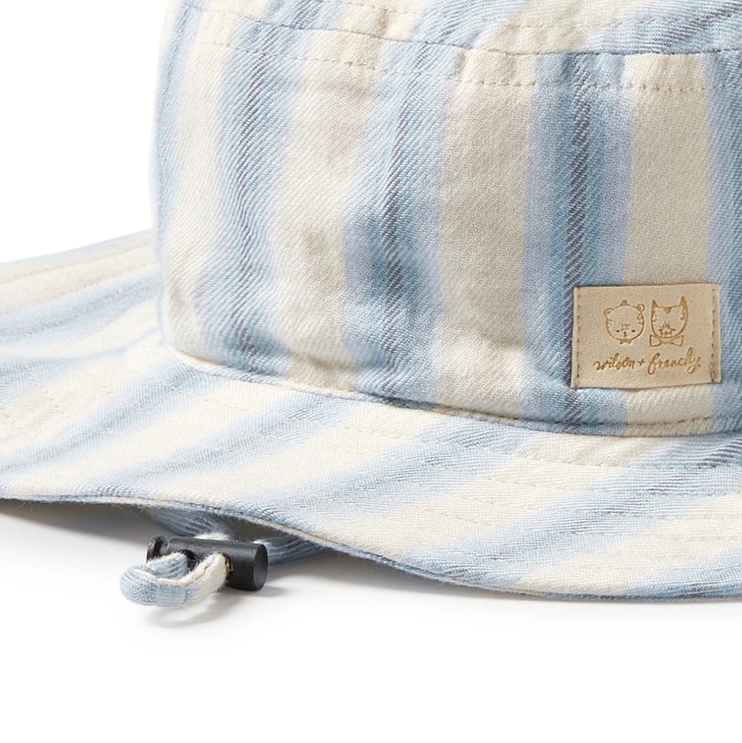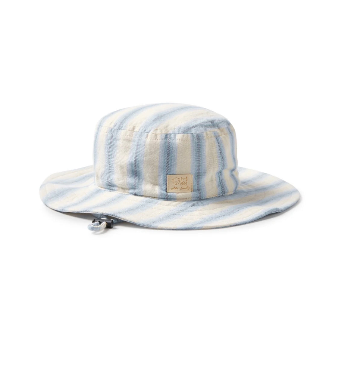 Keep your little one stylish and sun safe with this cute stripe sun hat. Perfect for summer, this organic cotton bucket hat is sure to brighten up any little one's day. It looks great, and is a must-have for your child's wardrobe. Key Features: Wide brim. Bucket shape. Soft washed. Frayed edges. Made with organic cotton. Australian owned and designed. Packaged in a bio-degradable bag. Details: 100% organic cotton. Machine washable. Made in India.