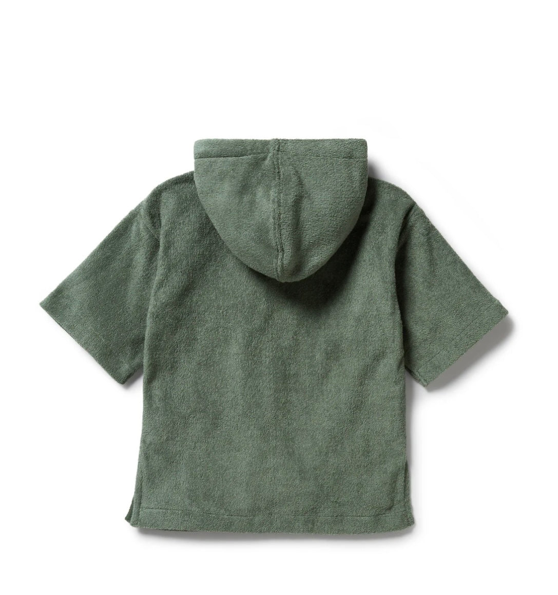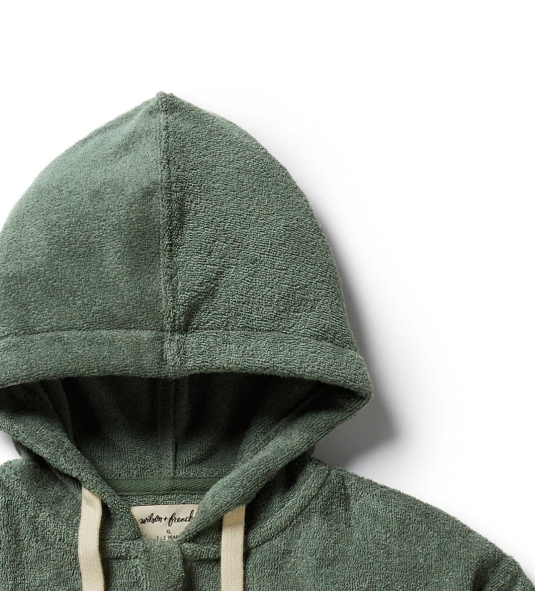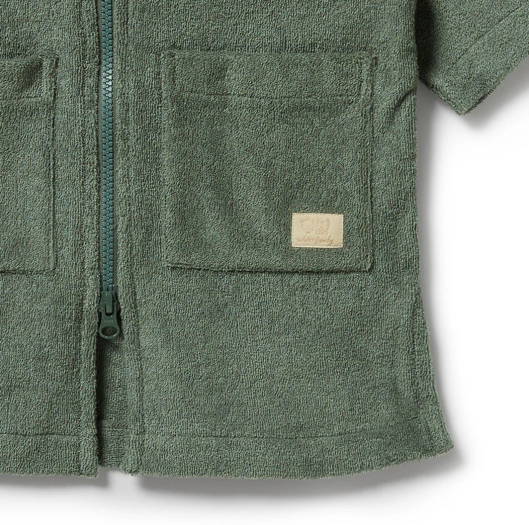 Keep your little one warm and dry after a splash with our super absorbent moss green hooded towel. Made from soft organic cotton terry towelling, it’s cosy and perfect for summer adventures. With a zip-up front and two handy patch pockets, it’s easy to pop on after the beach or pool – making change time quick, comfy, and cute. Key Features: Mid length. Functional pockets. 2 way zipper for easy dressing. Relaxed fit. Packaged in a bio-degradable bag. Details: 100% GOTS-certified organic cotton. Certified by: Ecocert, EGL 212333. Machine washable. Made in India.