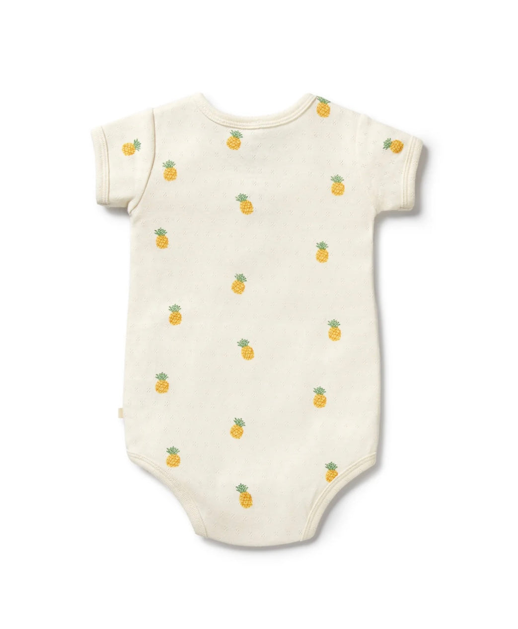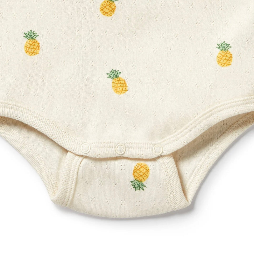 A soft, comfortable essential for your little one's wardrobe. This organic cotton pointelle bodysuit is breathable and features an all over print. With a side neck opening and easy snap crotch for quick changes, it's perfect for layering and everyday wear. Key Features: Side Neck Opening. Short Sleeved bodysuit. Snap leg closure for easy nappy changes. Made with GOTS-certified organic cotton. Sustainably produced. Packaged in a bio-degradable bag. Details: 100% GOTS-certified organic cotton. Certified by: Control union GCL - 3699. Machine washable. Made in India.