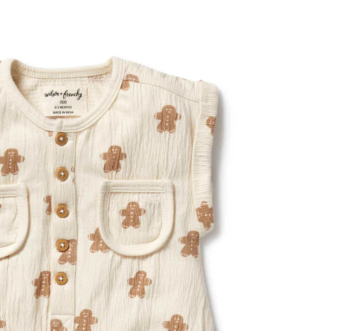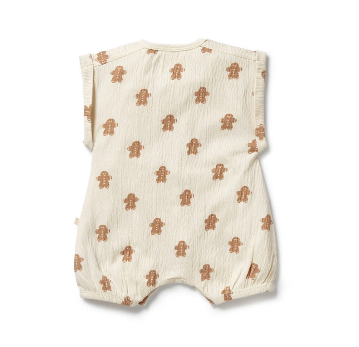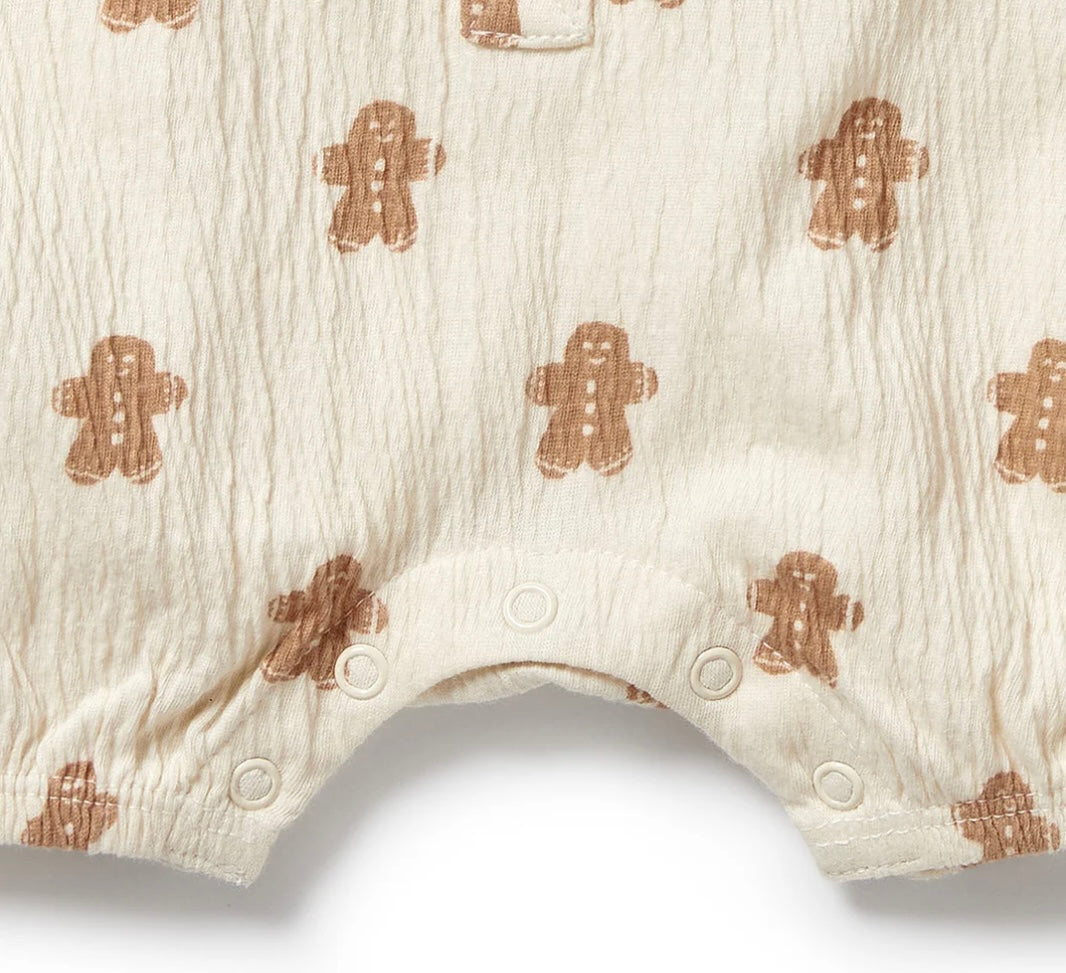 Celebrate the festive season in cosy style with our spice is nice crinkle cotton growsuit. Featuring a playful all-over gingerbread print, this short-sleeved growsuit is made from lightweight, breathable crinkle cotton—perfect for warm summer days and holiday celebrations. Designed with cute patch pockets on the chest and a roomy fit for all-day comfort, it also includes a henley button opening and snap leg closures for easy nappy changes. A cheerful and practical all-in-one outfit for baby's first Christmas and beyond. Key Features: Snap leg opening for easy nappy changes. Loose-fitting. Functional patch pockets. Button opening at front neck fuss-free dressing. A sweet and practical all-in-one summer outfit. Packaged in a bio-degradable bag. Details: 96% organic cotton, 3% polyester 1% elastane. Machine washable. Made in India.
