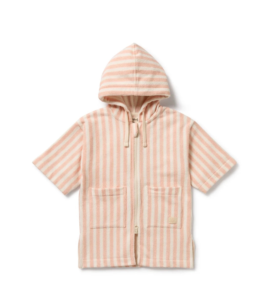 Wrap your little one in comfort with our super absorbent hooded towel. Made from organic cotton terry towelling with a stylish two-tone strawberry wave stripe, it’s soft, cosy, and perfect for drying off after a swim. Featuring a zip-up front and two patch pockets, it’s easy to throw on and keeps your little one warm, dry, and ready for the next adventure. Key Features: Mid length. Functional pockets. 2 way zipper for easy dressing. Relaxed fit. Packaged in a bio-degradable bag. Details: 100% GOTS-certified organic cotton. Certified by: Ecocert, EGL 212333. Machine washable. Made in India.