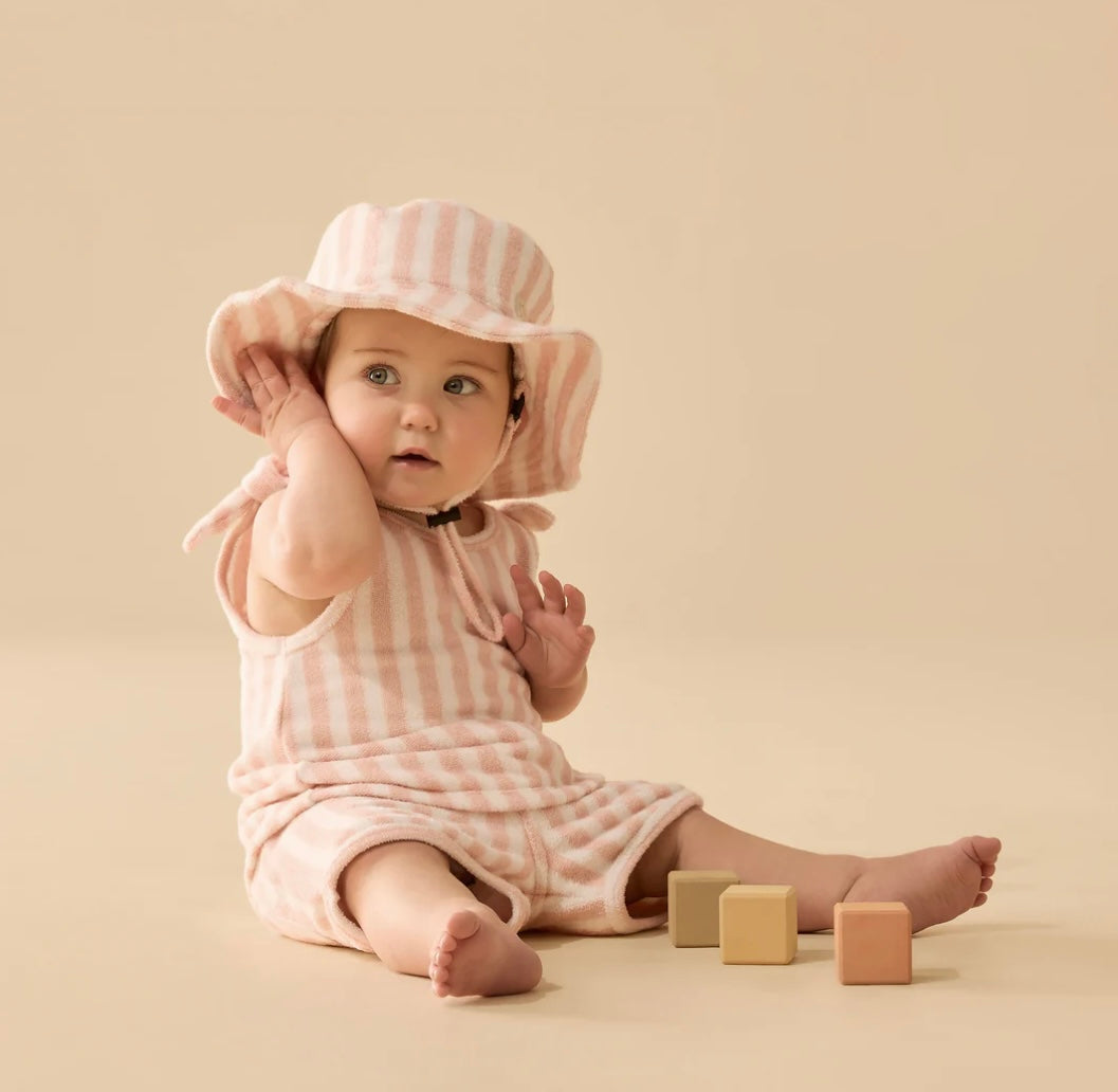 Keep little ones cool and protected with our GOTS-certified organic cotton terry towelling sun hat. Soft, absorbent, and perfect for sunny days, it features a fun two-tone strawberry wave stripe and a wide brim for extra sun coverage. The adjustable fit around the head and under the chin helps keep it snug and secure during play. Gentle on delicate skin and free from harmful chemicals, it’s a must-have for summer adventures. Key Features: Adjustable chin strap with breakaway clasp. Adjustable brim for a snug fit. Packaged in a bio-degradable bag. Details: 100% GOTS-certified organic cotton. Certified by: Ecocert, EGL 212333. Machine washable. Made in India.